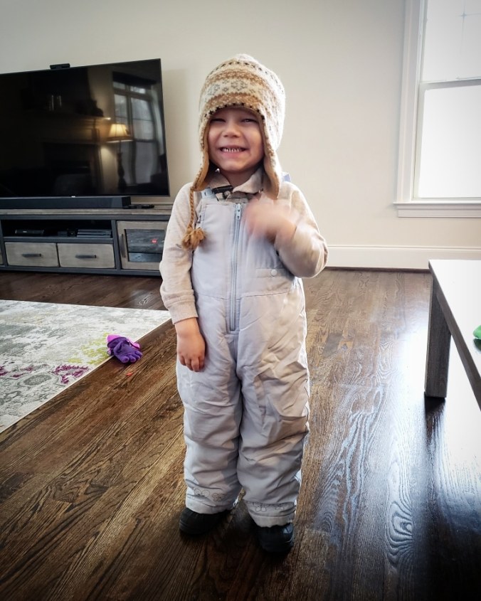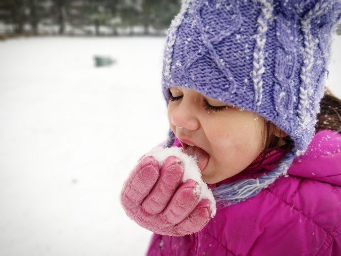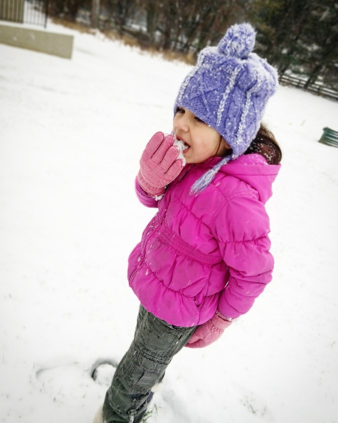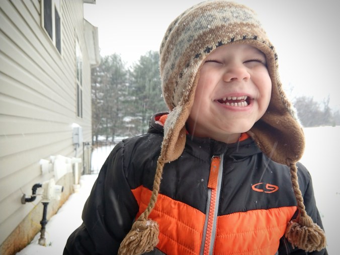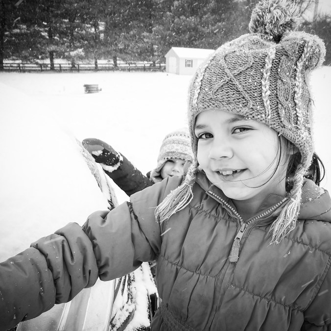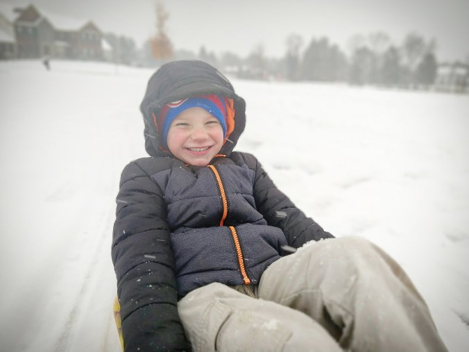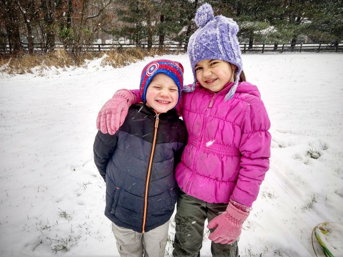 Today was nothing short of magical on the snow front! We had been expecting about an inch of snow, but instead we got 4-6! It caught me off guard, so I spent some time this morning digging out snow paraphernalia from the depths of moving boxes. I managed to cobble together enough clothing to send the kids out for some snow fun!! We raced around the house, went sled riding (we need a better hill!), ate a bunch of snow, and made snow angels.