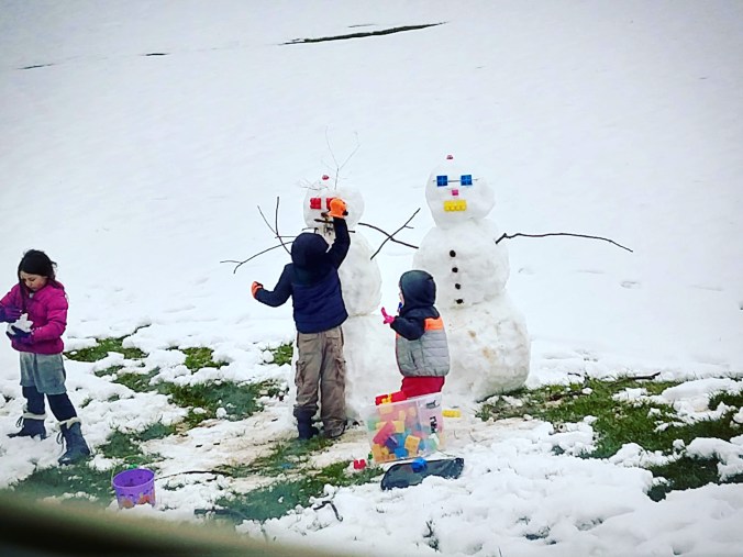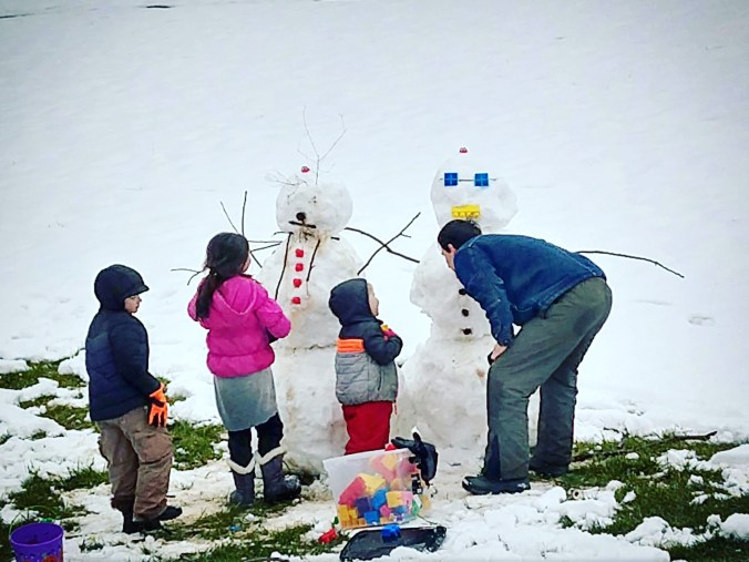 The kids have been begging all week to play more in the snow, but we haven’t had the chance. With a large rainstorm predicted for this weekend, I was happy to wake up to a dry morning. After breakfast, Tim and the kids went out to build their long awaited snowmen!