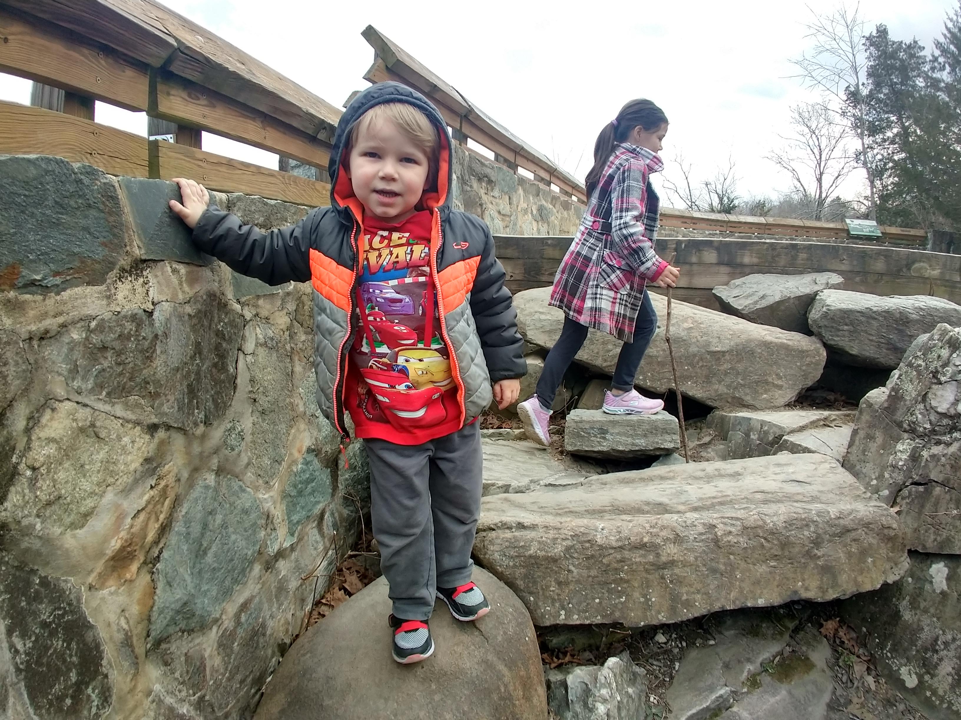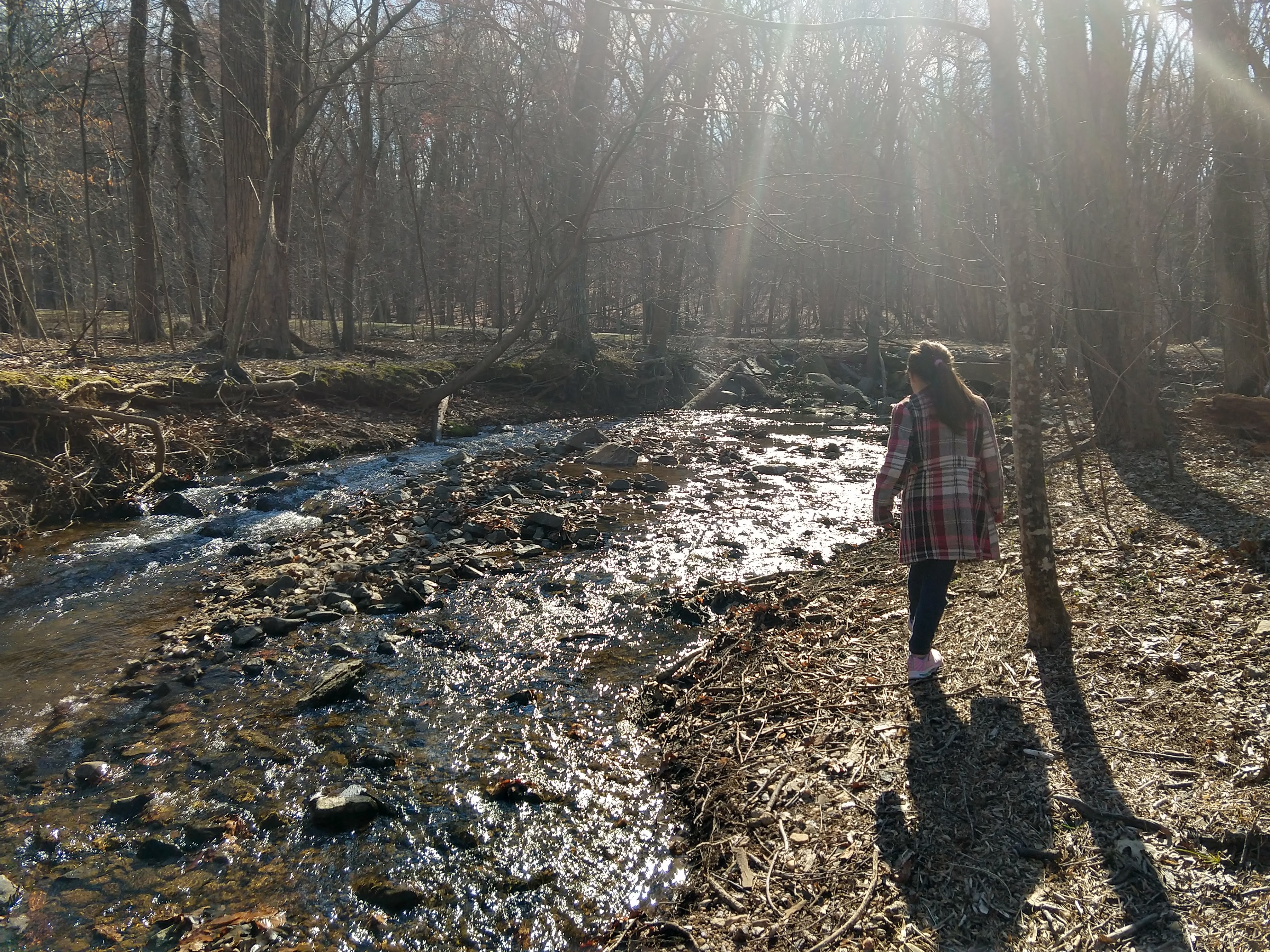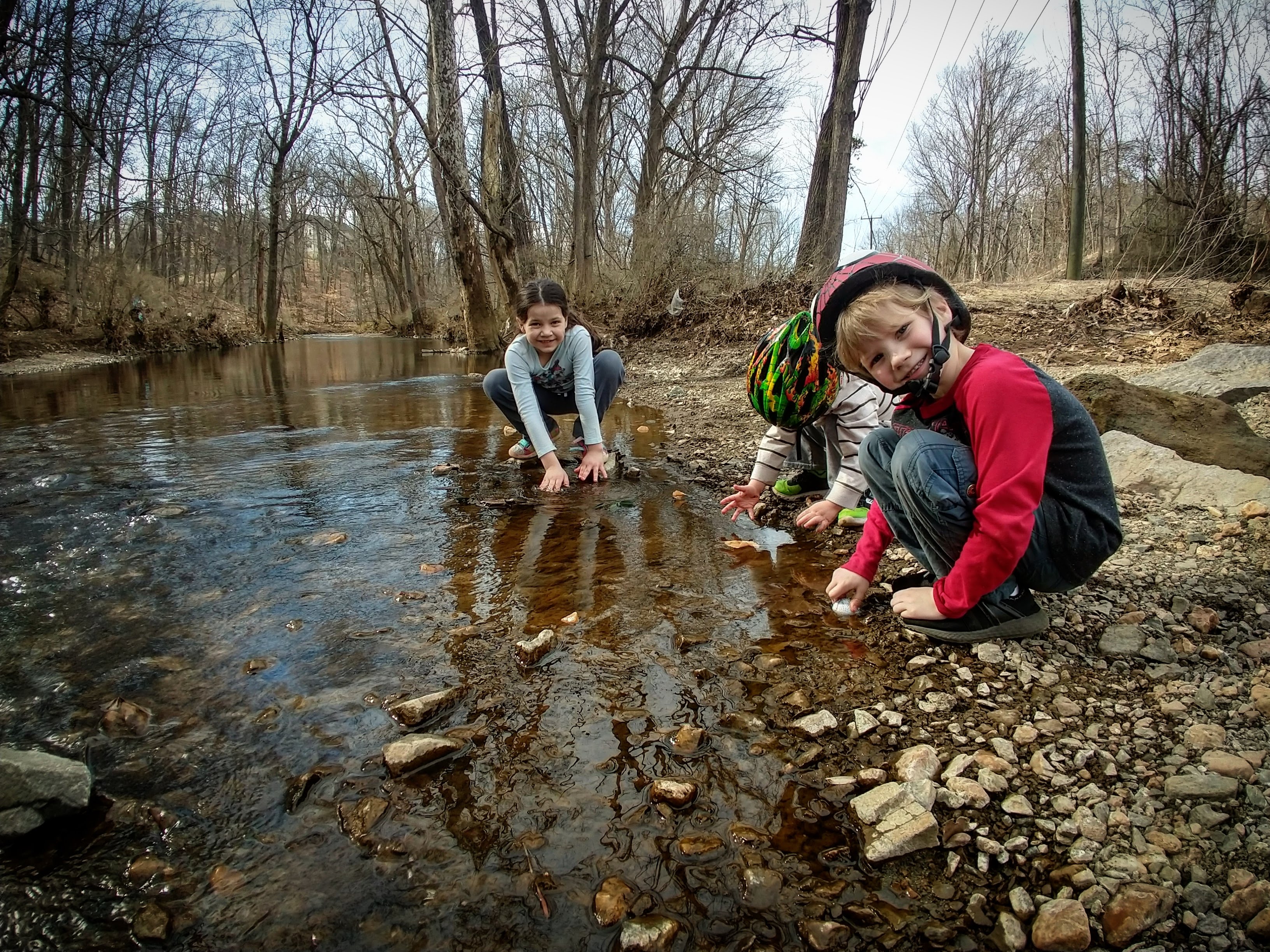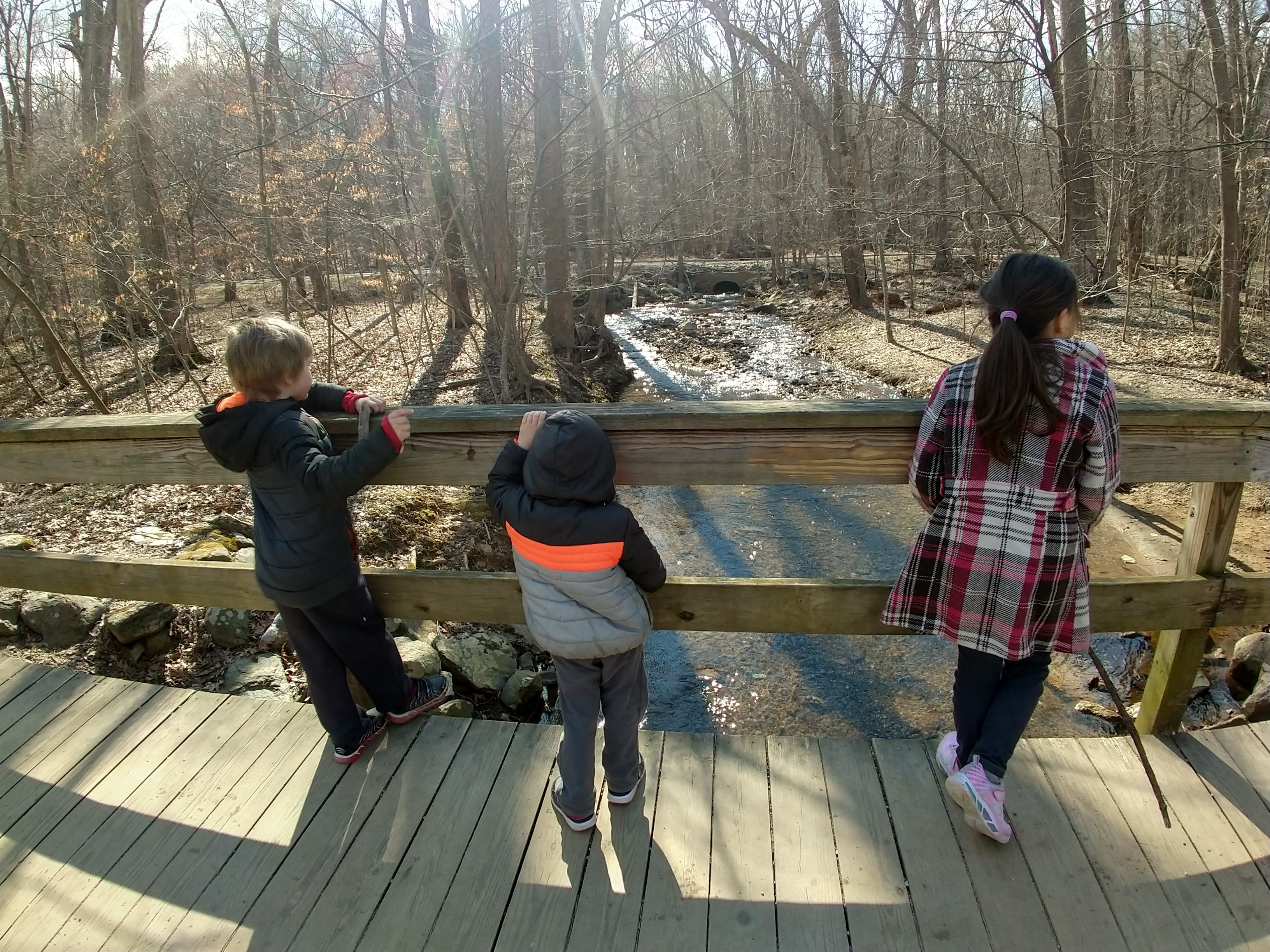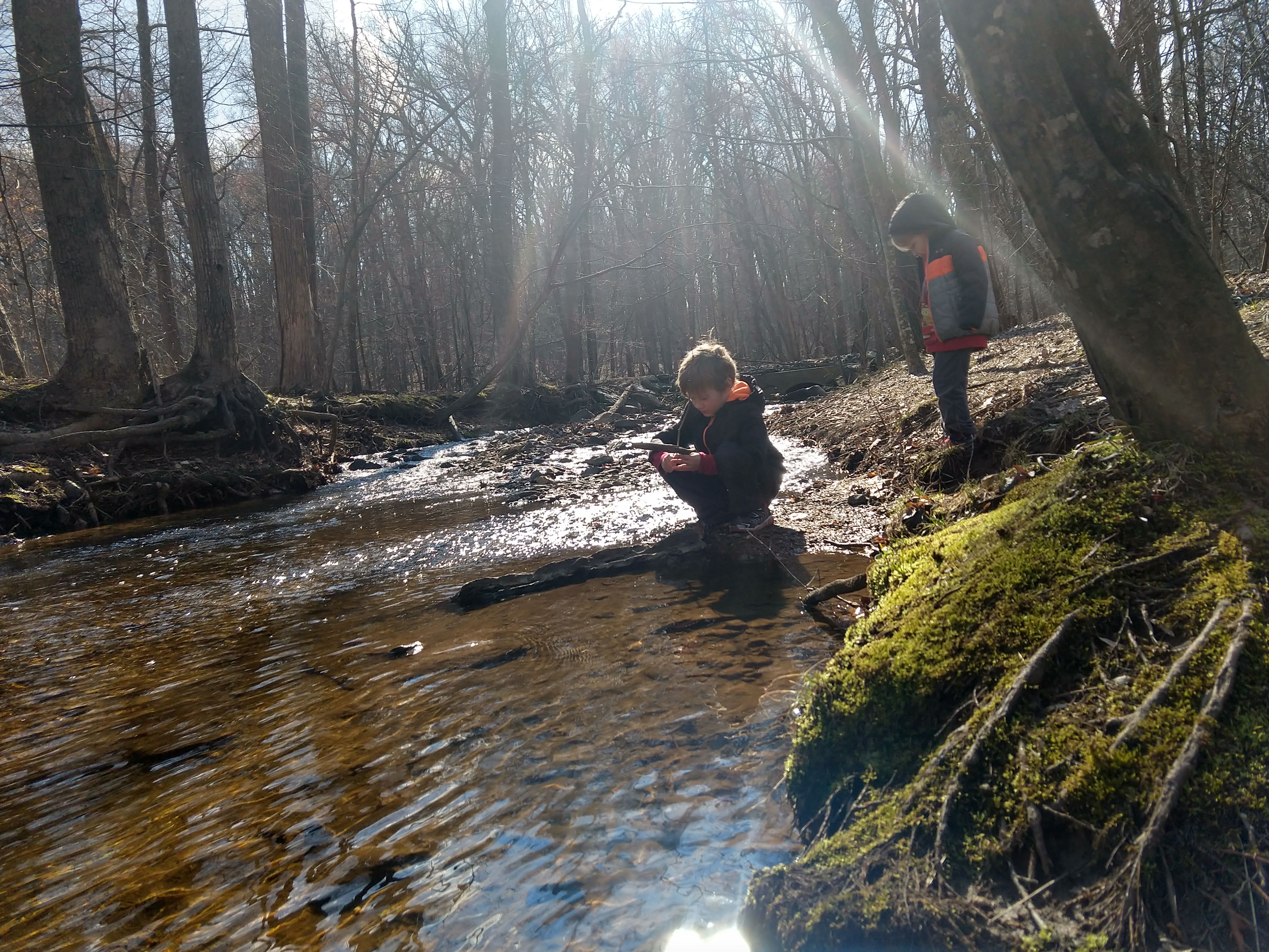 Today was beautiful. Absolutely gorgeous with temperatures in the upper 70s. There was no way we could stay inside. We did some school this morning and then after lunch we headed to our creek. The kids took their scooters and Baby E had his balance bike. We made it to the creek and the kids played on the edge- getting their fingers wet, tossing stones, and feeling the algae that now covers the creek bed. We wandered our way through the nearby woods, keeping parallel to the stream and eventually meandering back to it further down its banks. We climbed over rocks and up thorn bush covered hills and found our little corner of the world where we discovered the crayfish last year. We didn’t see any, but we did turn around to find ourselves within 30 feet of a huge doe traipsing through the underbrush. When we were done at the creek we played on the playground until it was time to go home. Once home we spent the rest of the evening outside.