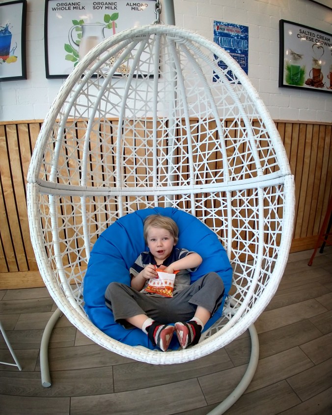 This is Baby E sitting happily in the egg chair in one of his favorite places, the bubble tea store. He might hate bread with every fiber of his being, but this kid loves bubble tea. Go figure.