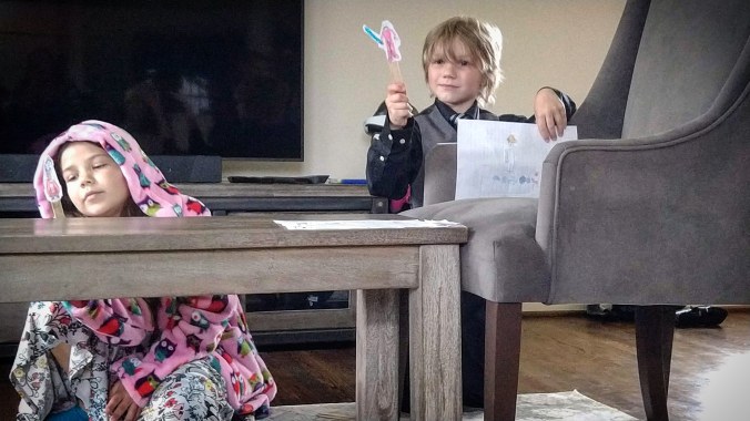 This afternoon our living room transformed into a theatre complete with stage and scenery. The kids gave us each a ticket to come and watch a special Mother’s Day Production of the CE Play (a play written and performed by C and But E.) It was a perfectly adorable gift from my sweet babies for Mother’s Day!