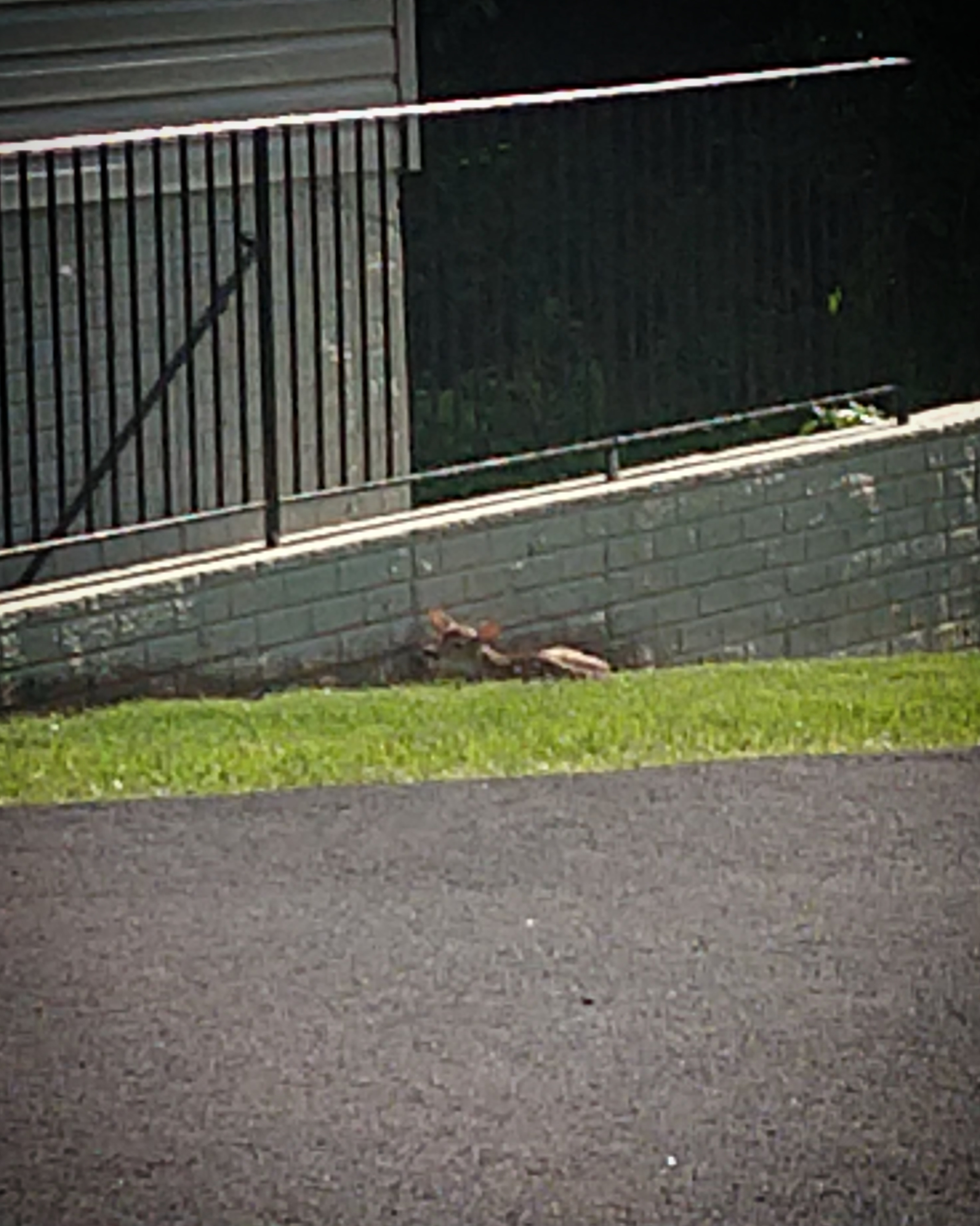 The tiniest little deer took up residence next to our basement stairs this afternoon. It couldn’t have been more than a week old. After sitting motionless watching us, it jumped up on wobbly legs, bounced off the house and took off across the yard. It met up with its mother across the street.