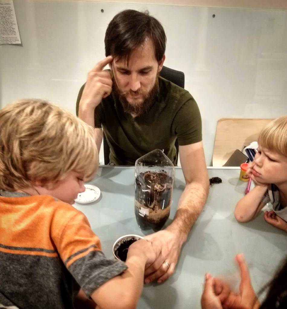Tim and the kids worked on the earthworm habitat last night as I was making dinner. I could hear them in the next room talking about the various layers of dirt and sand that they were adding to the container. They took turns picking worms out of the carton and adding them to their new home. They carefully covered the outside with black construction paper to encourage the worms to dig deep in their new habitat. Now they get to observe them for the next few weeks and see how they settle into their new habitat. Fingers crossed we don’t kill them off.