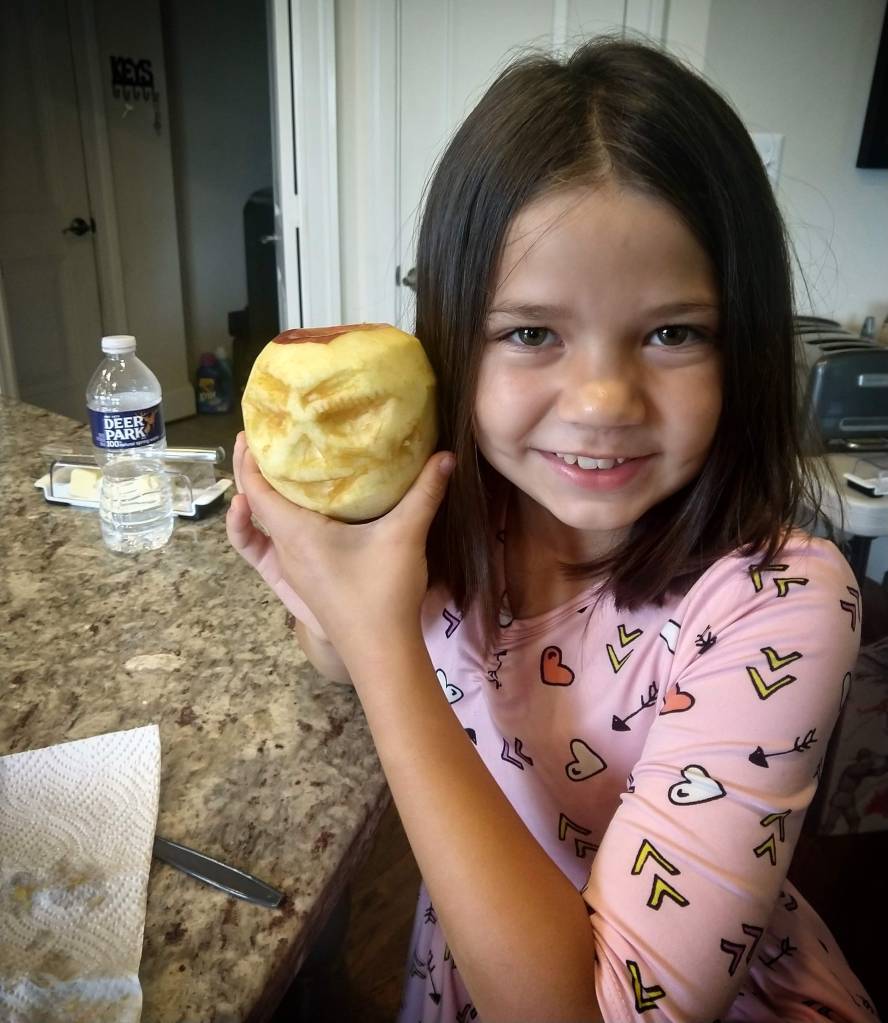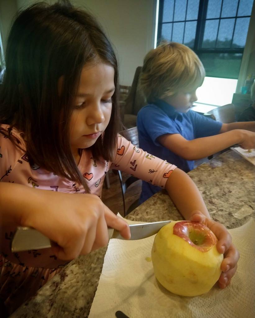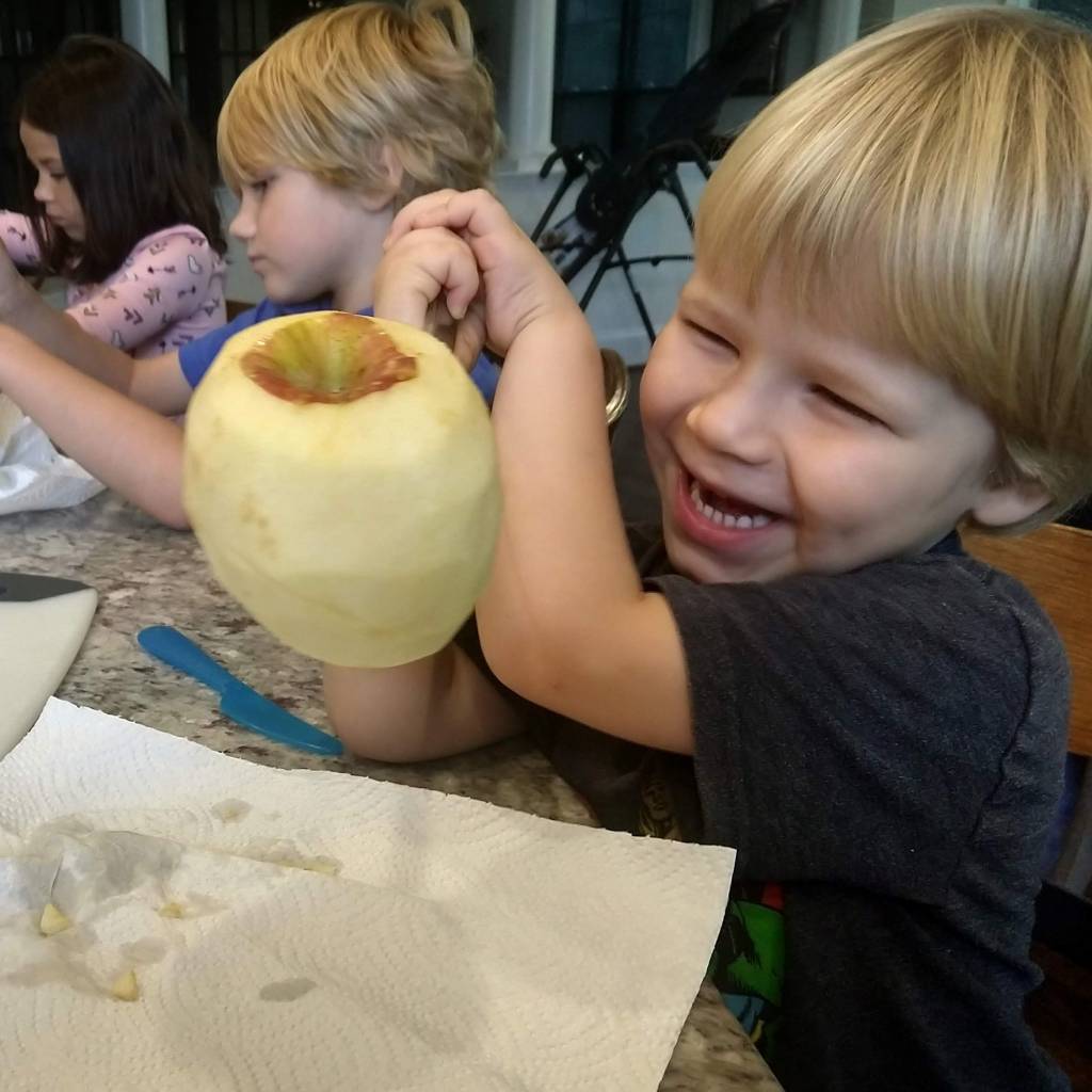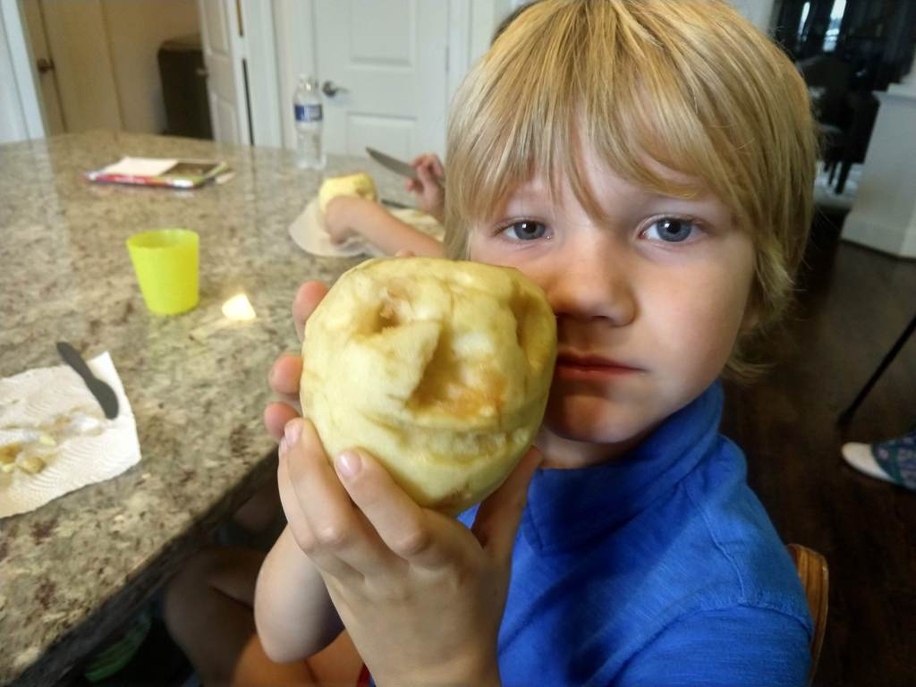 It started out innocently enough. I peeled the apples. Three big ones for the kids and a little one for myself. Each kid had the liberty to carve their apple however they chose.