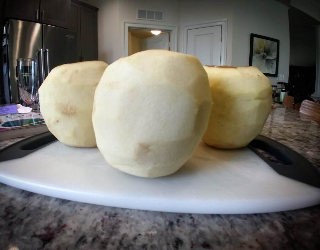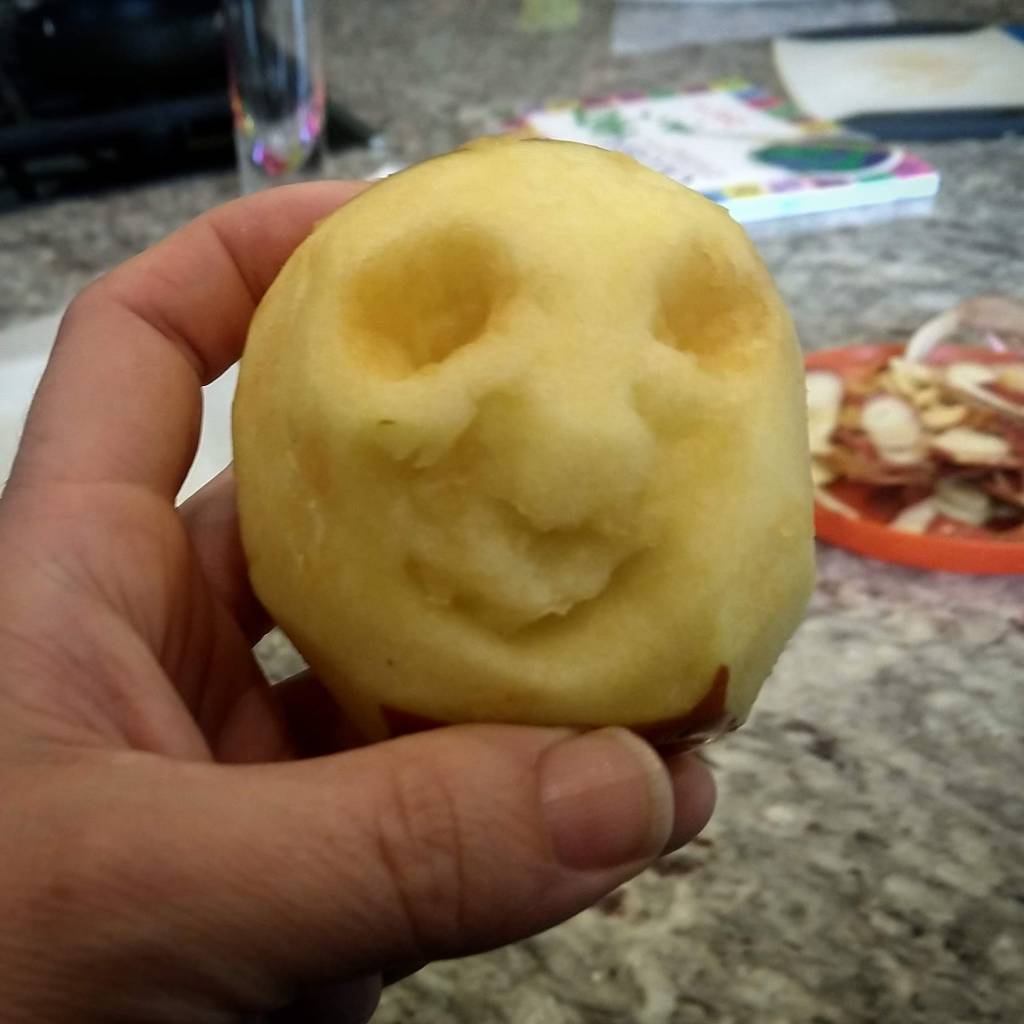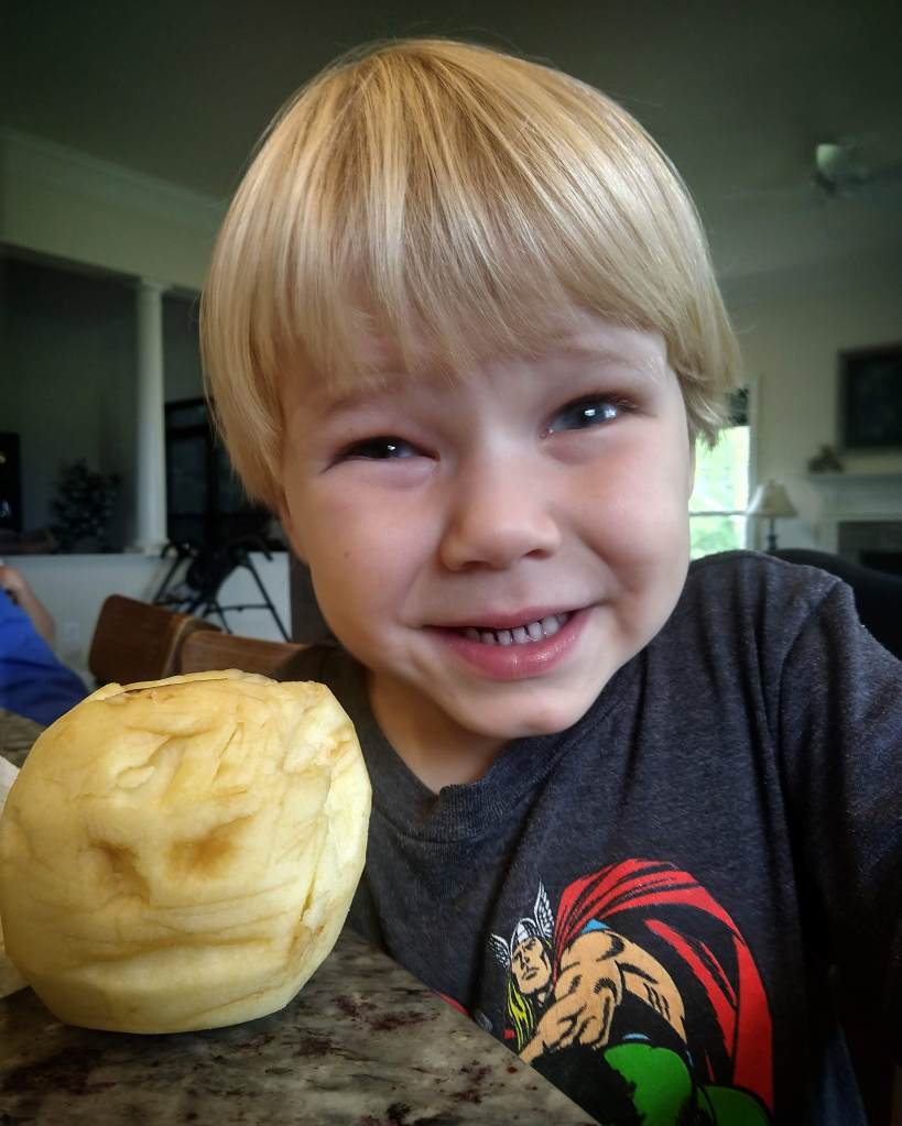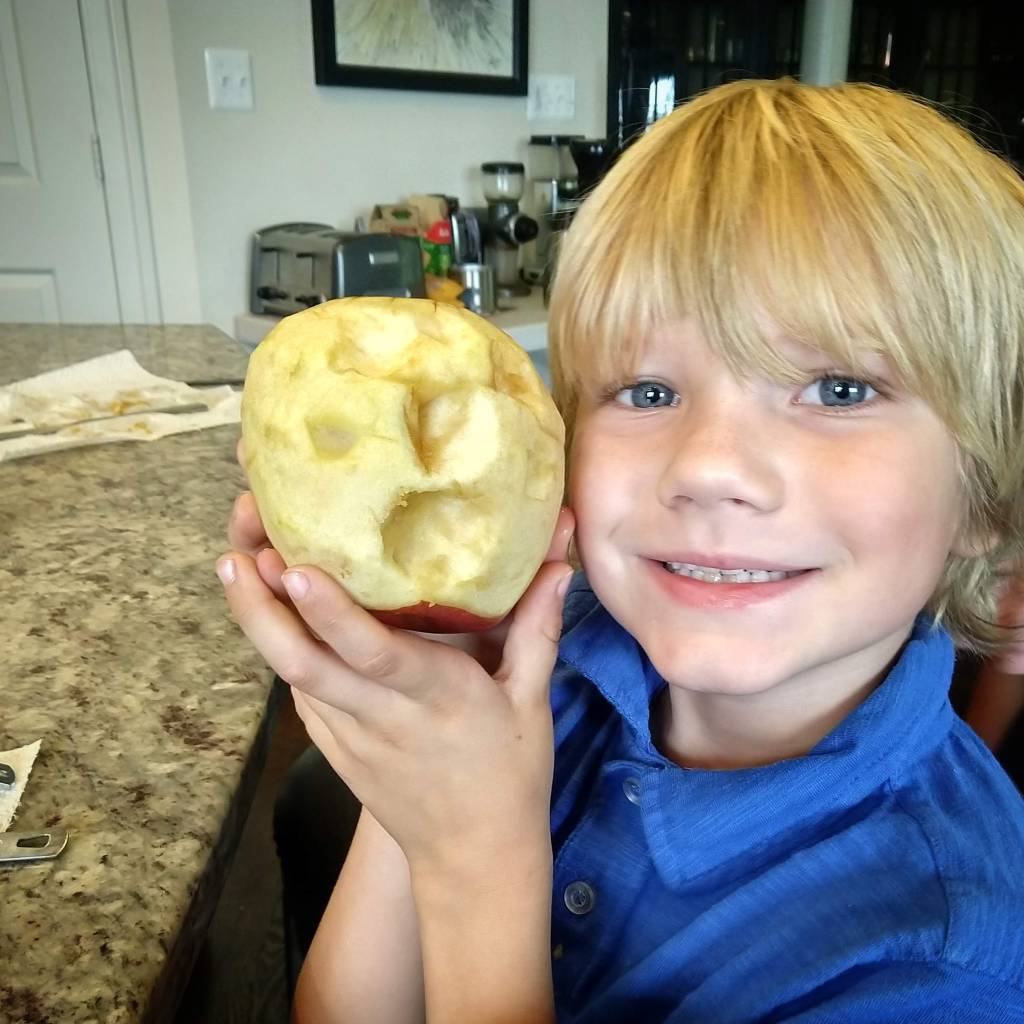 It started out innocently enough. I peeled the apples. Three big ones for the kids and a little one for myself. Each kid had the liberty to carve their apple however they chose.
