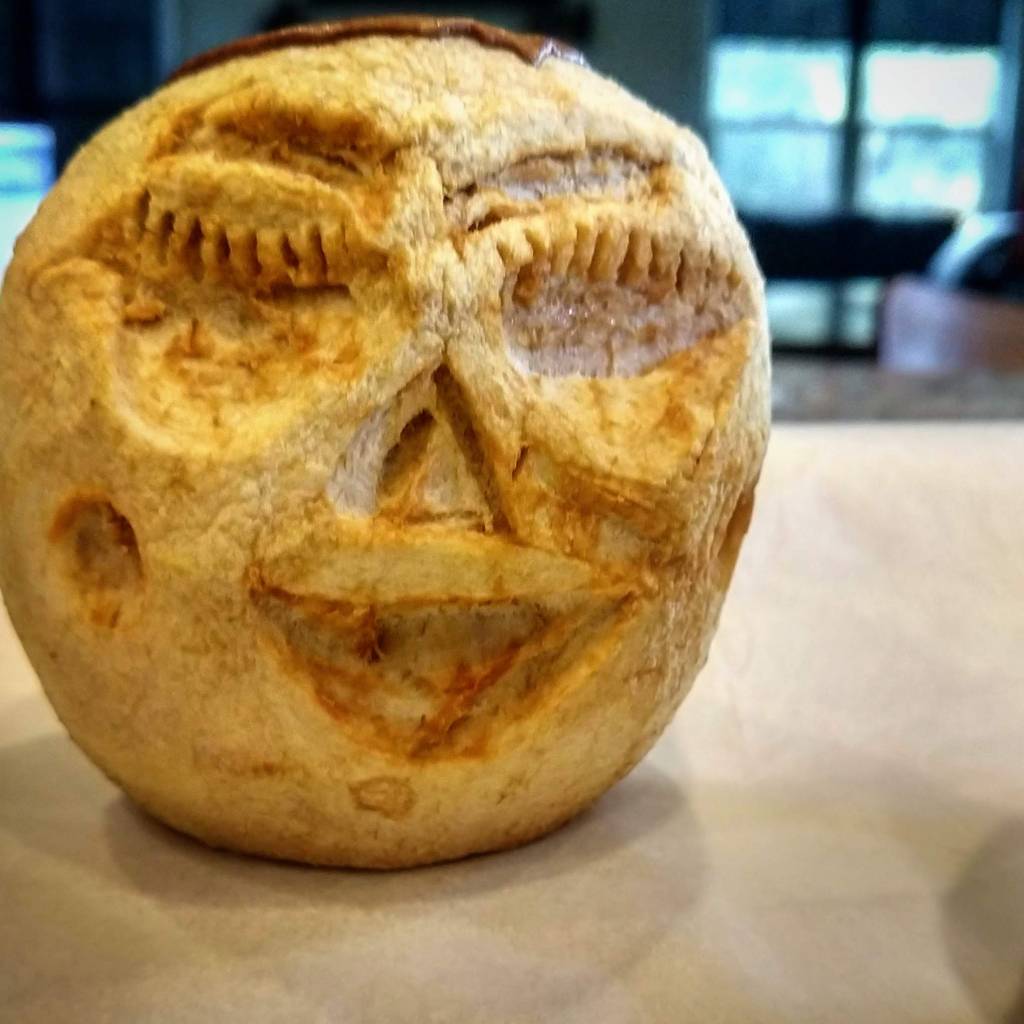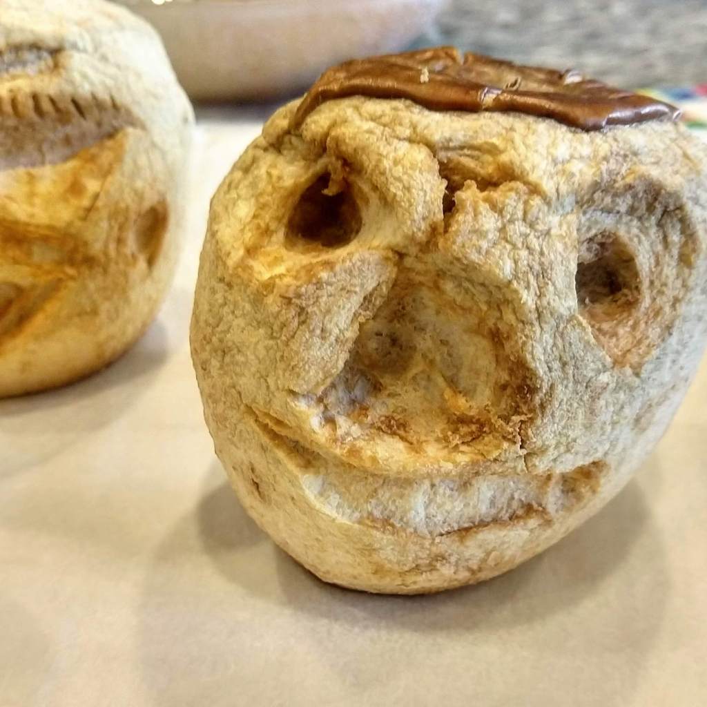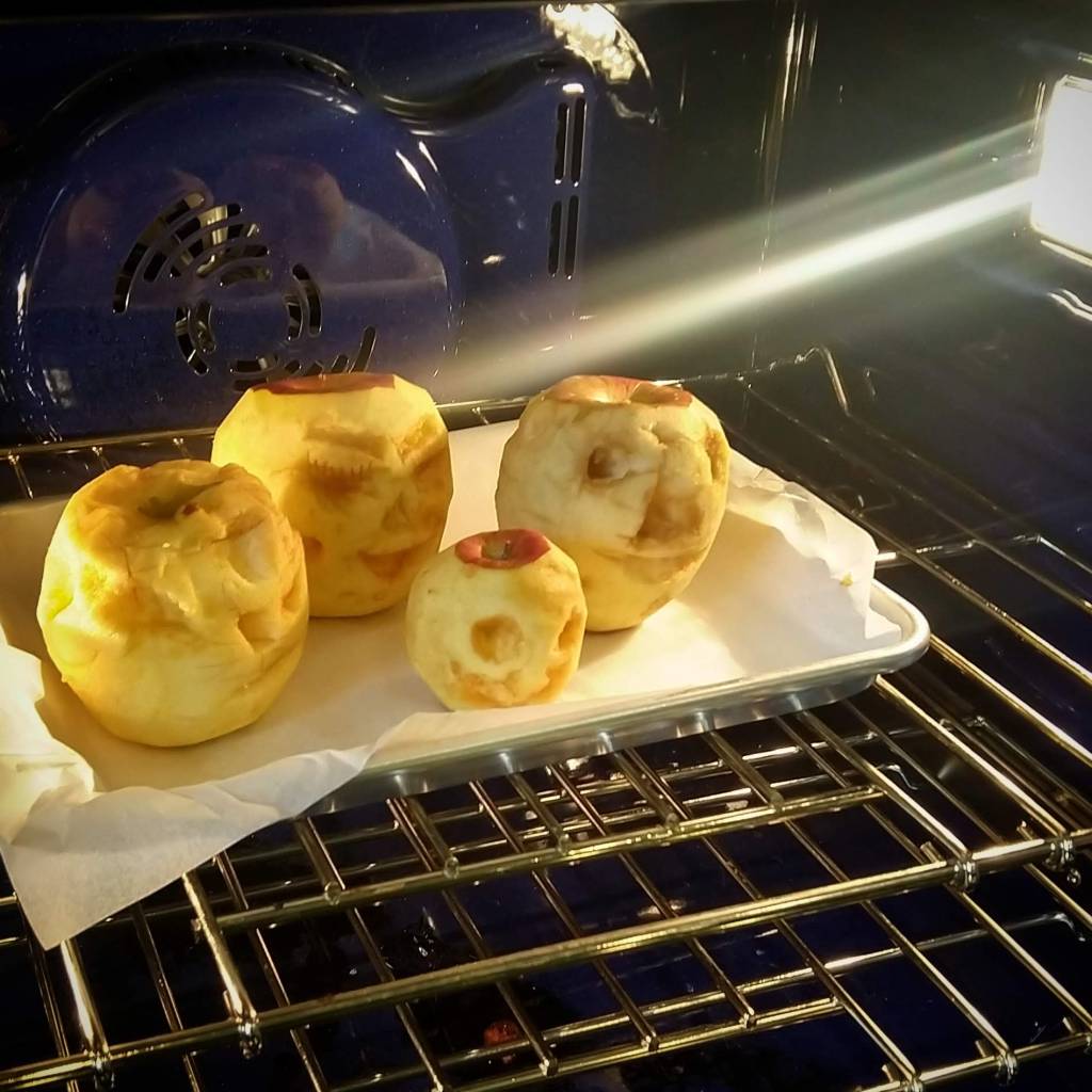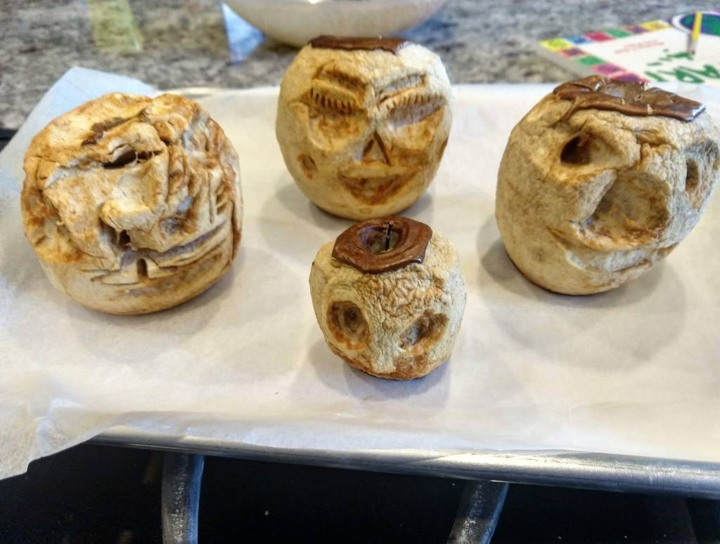 It all seemed to be going so well. The kids used a variety of tools… Plastic knives, butter knives, spoons, and even a can opener. Baby E ate every chunk he carved out. He kept inflicting damage so that he’d have more morsels to munch on. Big E created a happy face. Mine looked a little dopey. C’s was happy… …and mad.The back of Big E’s was surprised. When they were all done, I lined them on the cookie sheet. I set the oven for 200 degrees and when it was heated up, I put them in the oven. We waved goodbye and told them to enjoy their day at the spa. Then we went about our business. The directions said they should stay in the oven for ‘most of the day.’ So we left them in for nine hours.And then we took them out.Nightmare fodder.