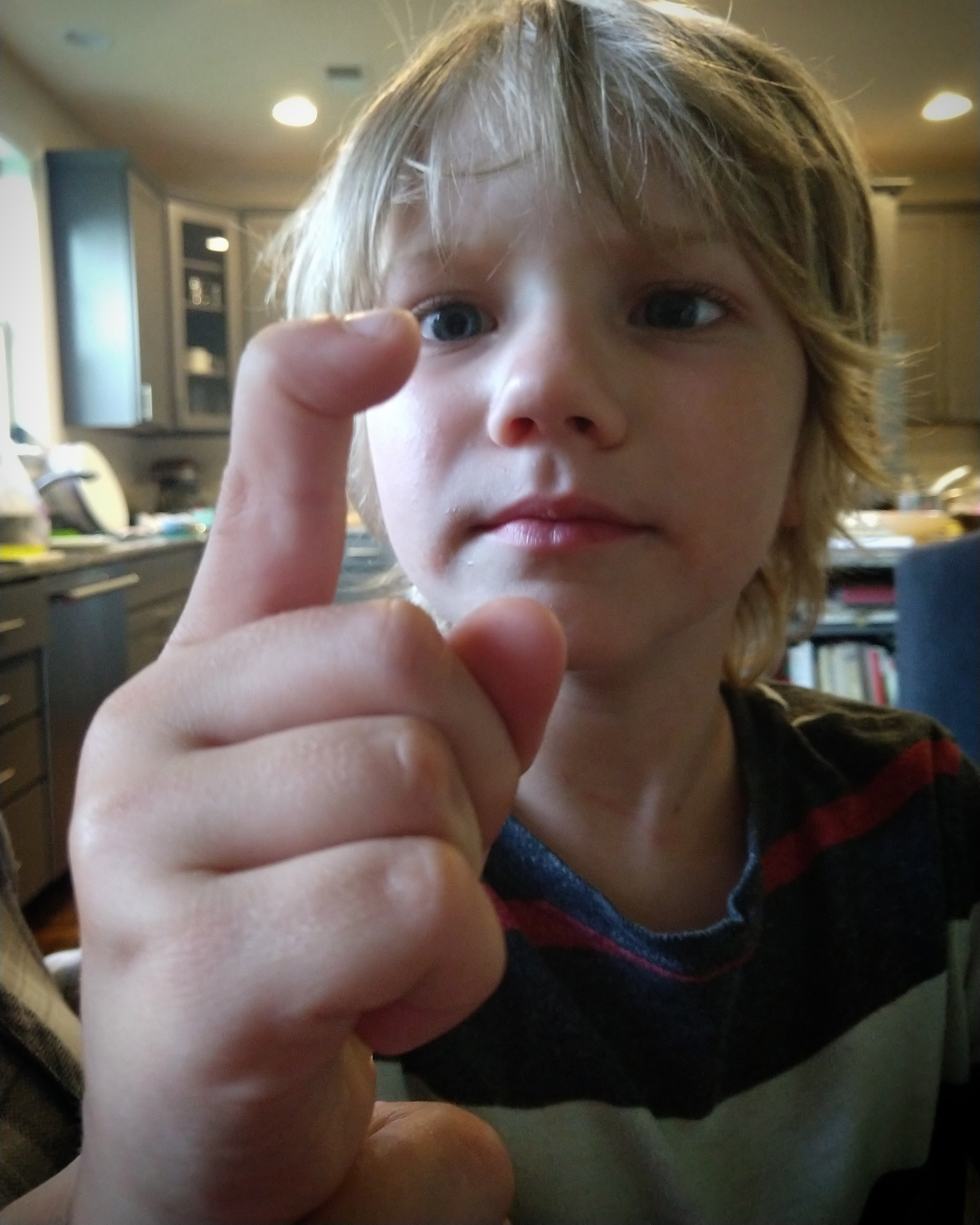Baby E has this crazy ability to bend only the top knuckle of his pointer finger. The rest of his finger stays straight while the tip of his finger bends at a 90 degree angle. This evening as he was demonstrating his unusual talent, Big E discovered he could do that as well.